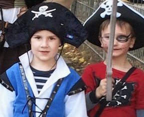 Finn ist nämlich krank zu Hause mit einem Magen-Darm-Infekt und liegt auf der Couch – „bitte schreib nicht im Arbeitszimmer sondern hier, damit ich nicht so allein bin. Ich stör dich auch nicht“. Tut er auch nicht – aber ich bin nicht sicher, was für einen Schreibstil Pippi Langstrumpf im Ohr bewirkt ;- )Jungs mit Piratenverkleidung. Foto: Nina Weber